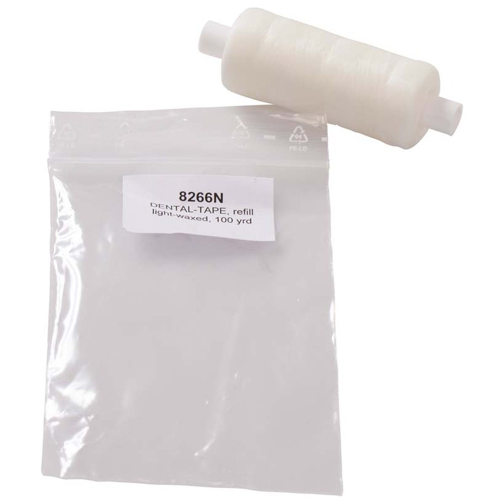 DENTAL-TAPE refill är en vaxed dentaltejp. Här ligger flera trådar bredvid varandra och hålls i form av ett lager vax. Tejpen är bredare än tandtråd och används för större mellanrum mellan tänderna. 100 yard (92 m)