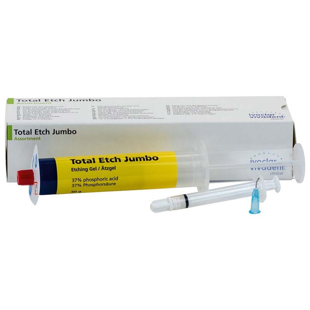 Innehåll: 1 x 30 g Total Etch Jumbo spruta, 10 st. appliceringsspetsar. 1 tom, påfyllningsbar spruta och 1 oprintad, blank etikett för att markera batchnummer samt utgångsdatum som är printad på Jumbosprutan.